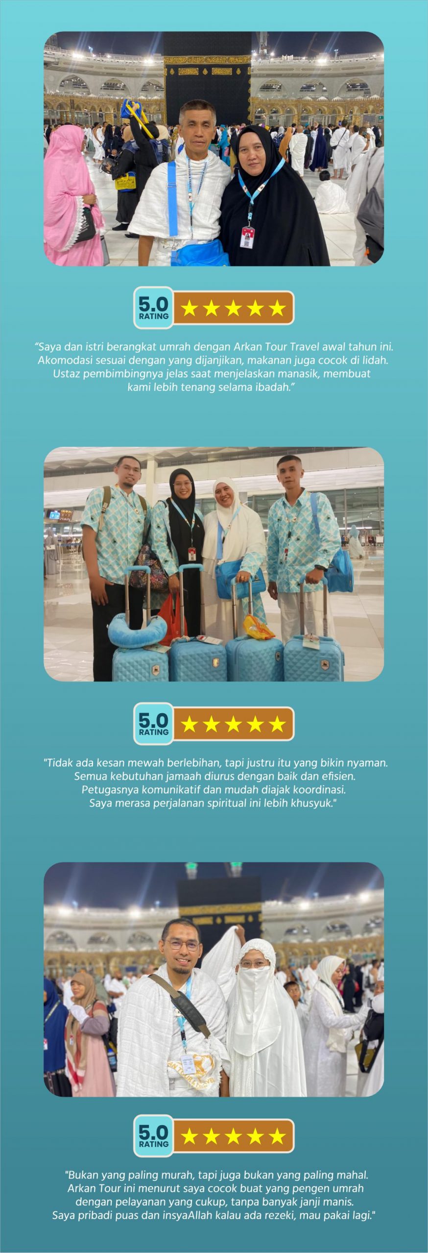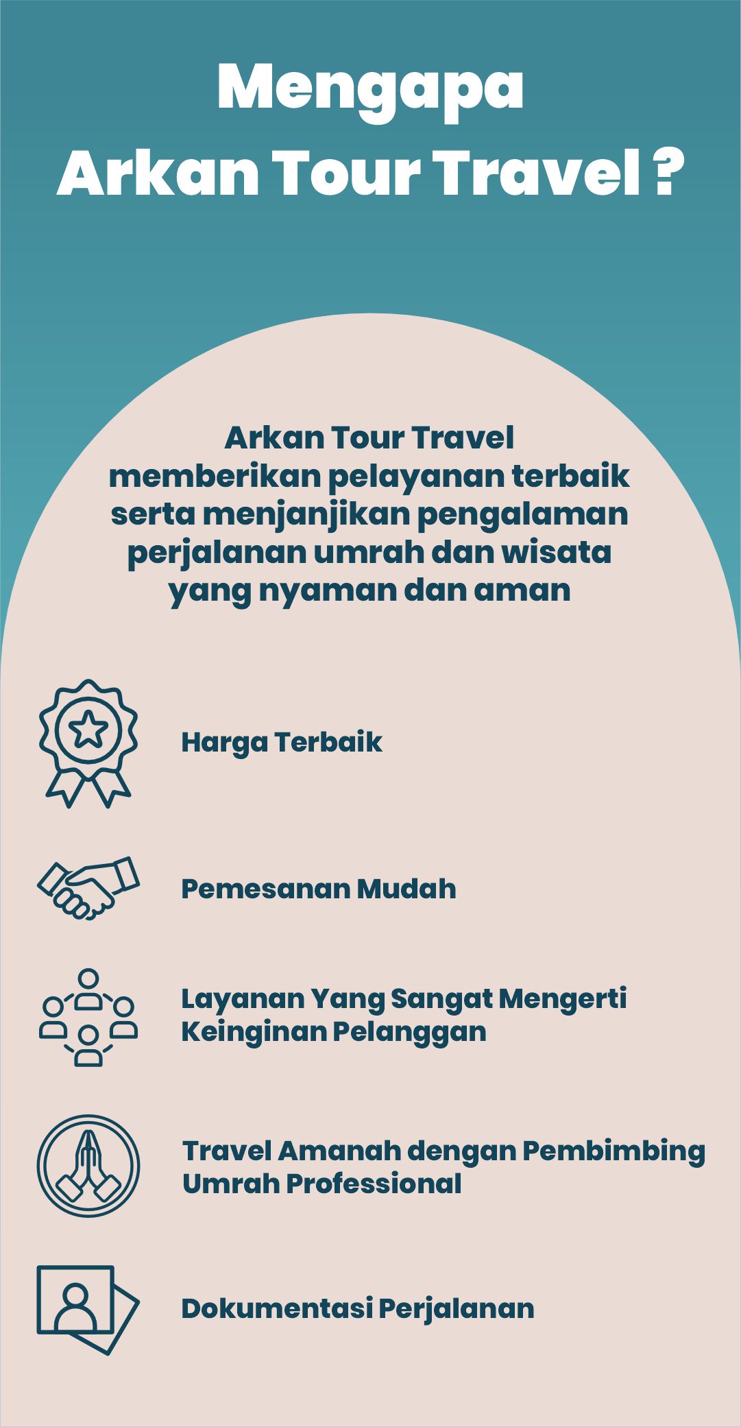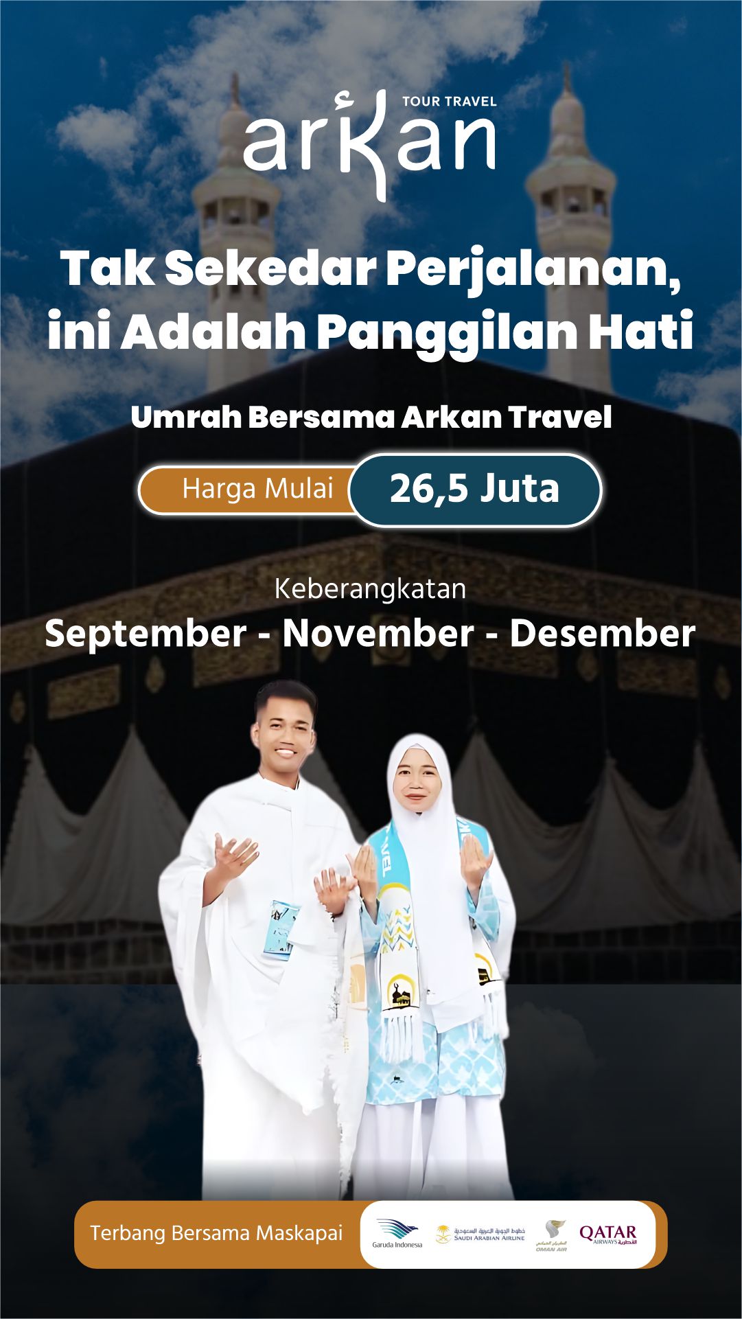 “Panggilan suci-Nya telah tiba. Jangan tunda lagi.”Bersama Arkan Tour Travel, wujudkan perjalanan ibadah Umrah yang nyaman dan penuh berkah.